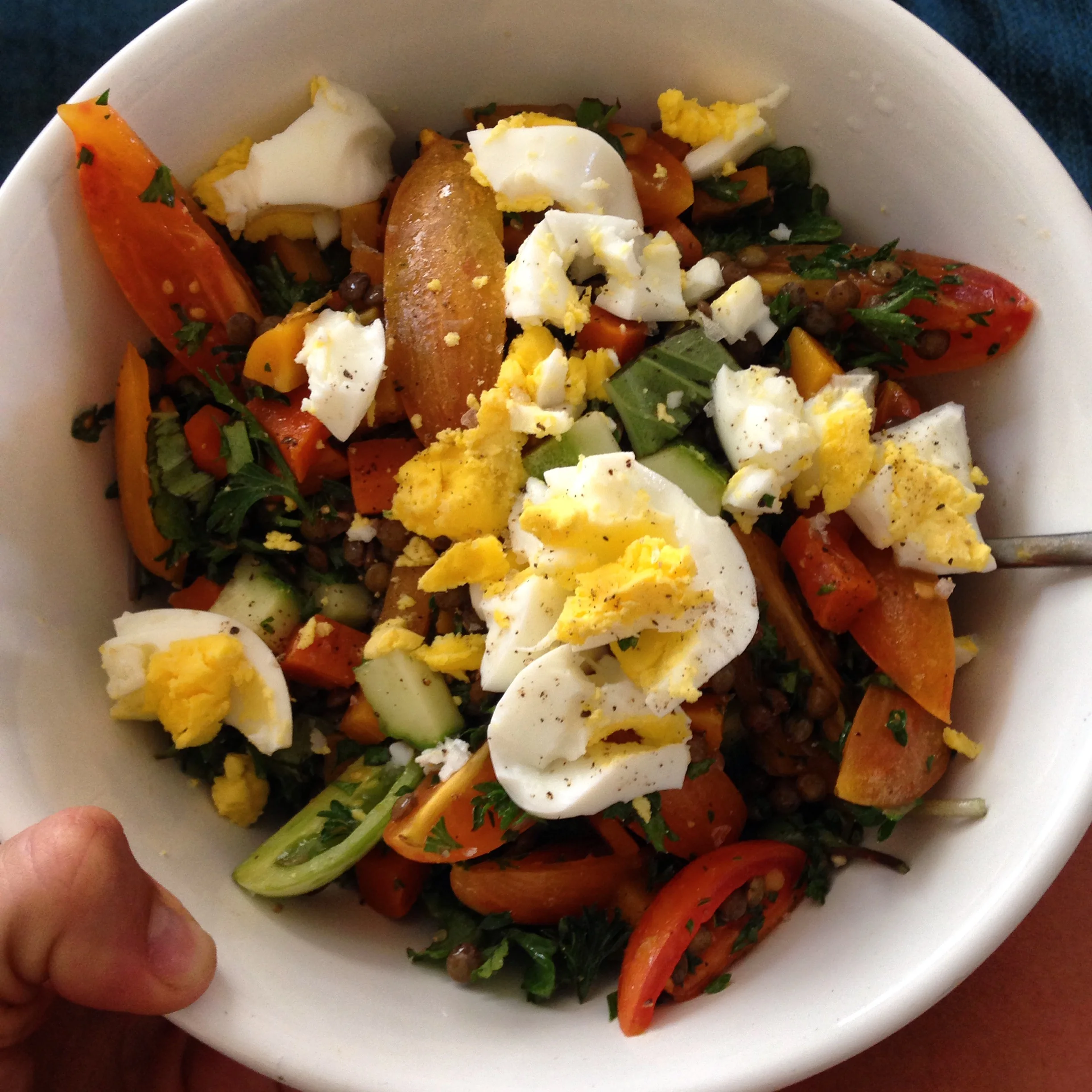 In it was baby kale; puy lentils; rainbow carrots; Eatwell Farm tomatoes, basil, parsley, and cucumbers; sous vide quinoa (I did it because they paid me); a 7-minute egg; garlic oil; sherry vinegar; pepper; and two kinds of salt because I'm an asshole. I ate this for several meals. It was fucking delicious.