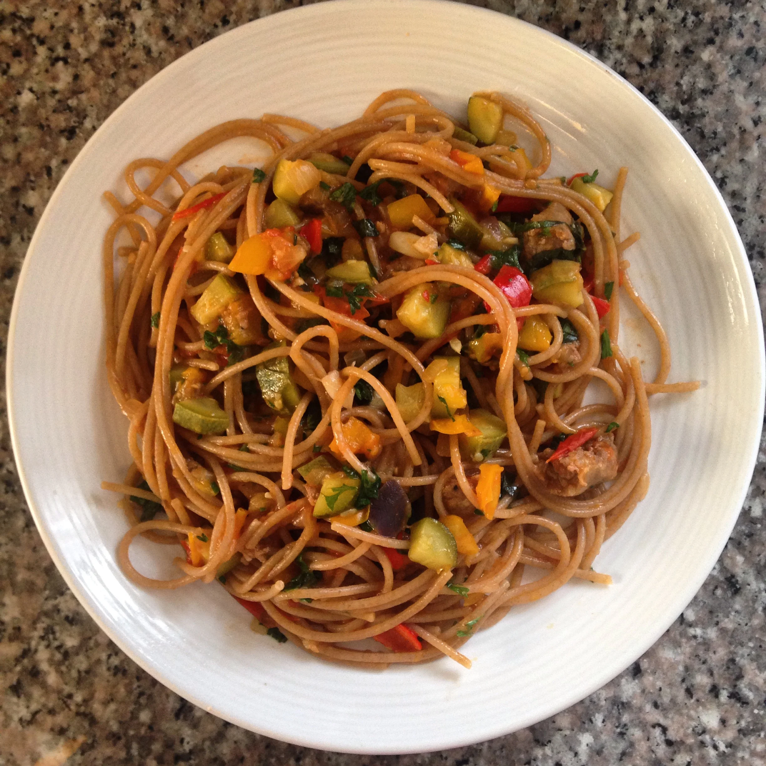Somehow I managed to cook two actual meals at home this week that had nothing to do with work projects. This dinner had a mix of vegetables from my CSA and some from the sale bin at Berkeley Bowl (the 99-cent bags were ON POINT yesterday), some sad freezer-burnt but still okay Italian sausage I rescued out from under several bags of frozen chicken bones, and whole wheat spaghetti (for virtue?). IDK, I think I'm pretty good at making pasta at home — the secret is animal fat (butter, rendered sausage fat, whatever) and stirring in more pasta water than you think you will need to use.