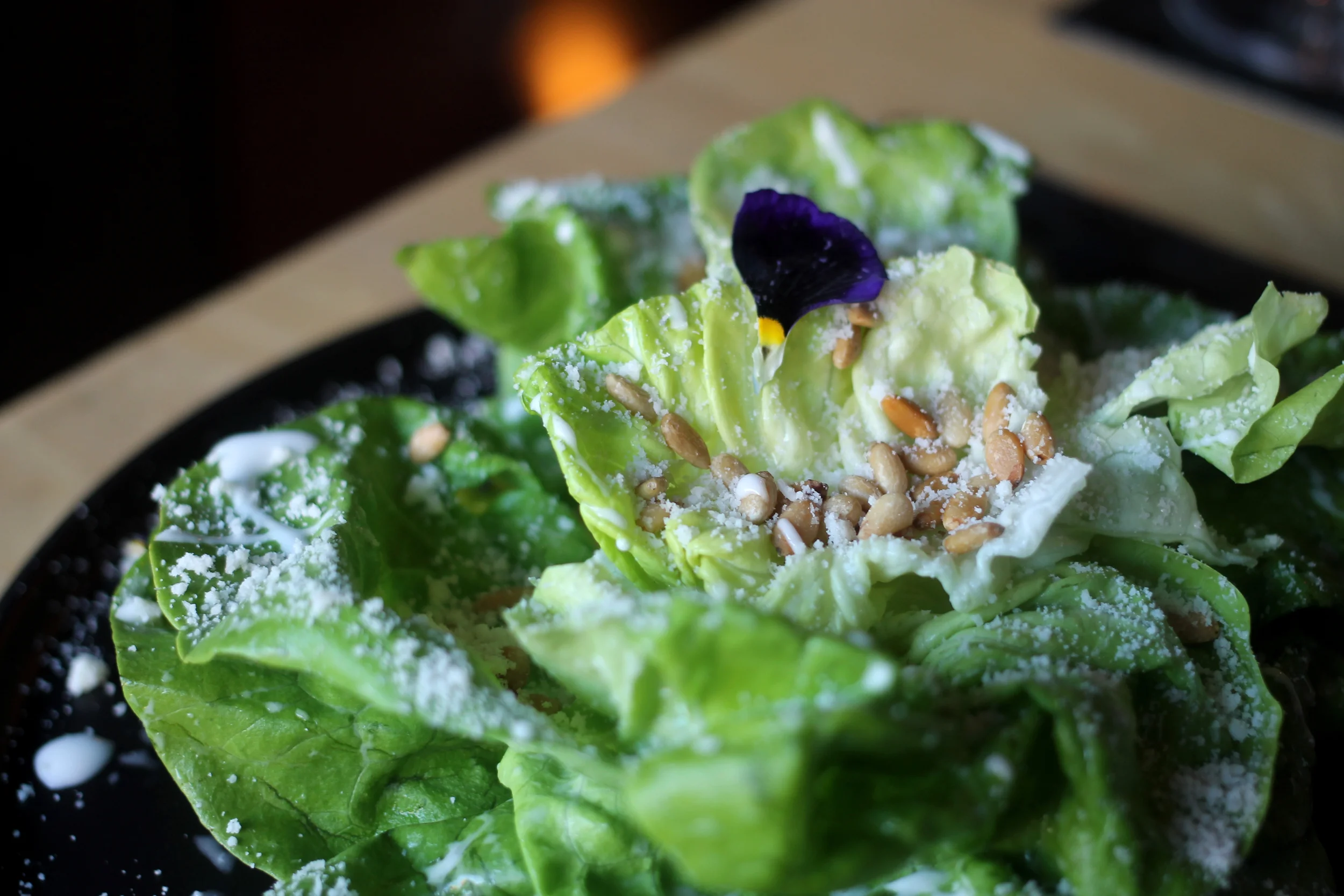 I started with a couple of glasses of rose — the number was unintentional, I swear! There was a mix-up with my drink order, so my server brought me both pink wine options. My favorite was the sparkling brut rose from Veneto. Then we shared a massive butter lettuce salad with just a bit of Grana Padano, pine nuts, and some edible flowers. Usually I really hate it when salads are very sparsely dressed, but this one worked. The lettuce was so fresh that I almost felt like I had brought some cheese and nuts out to a garden and plucked lettuce leaves up one by one to eat with the toppings.