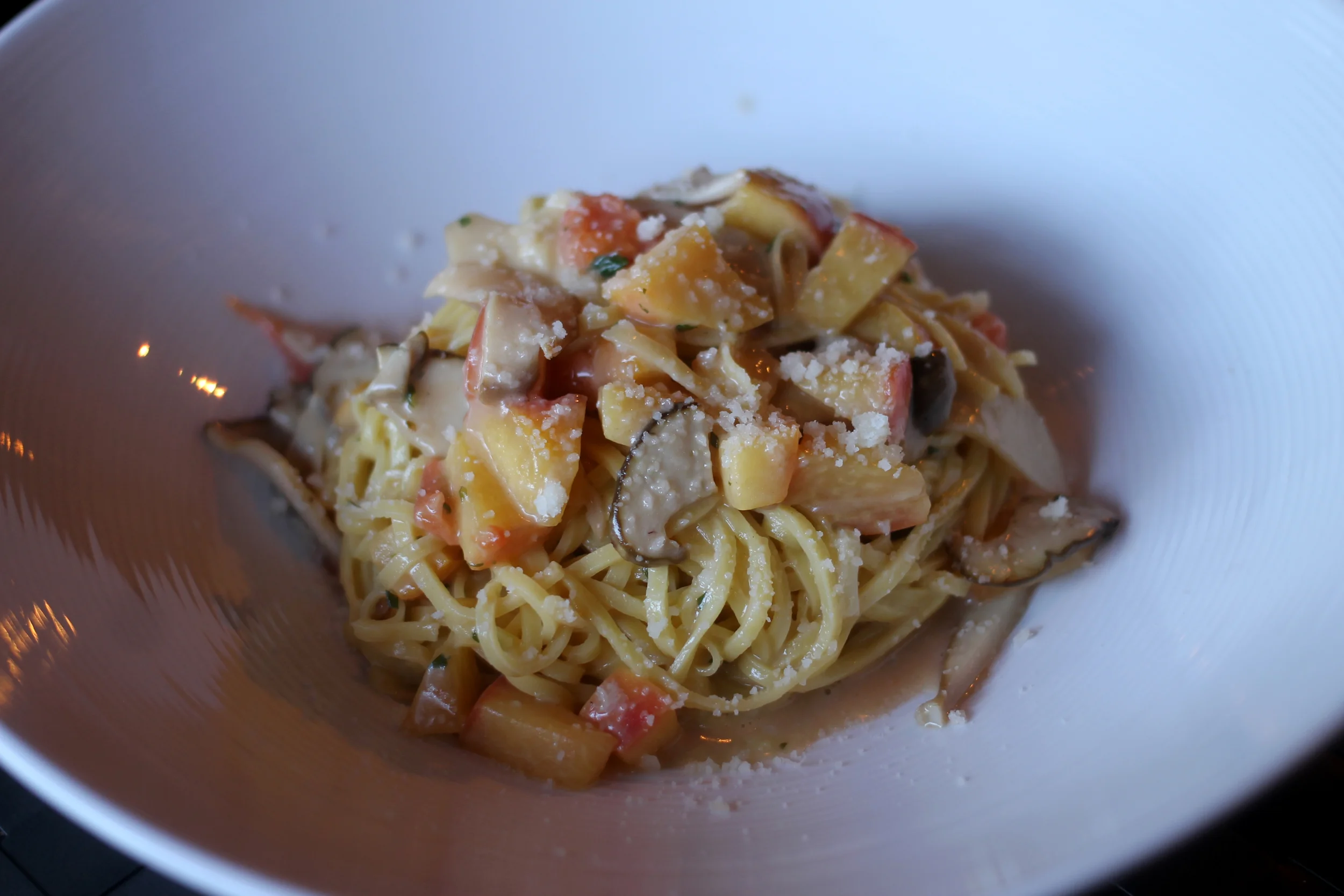 Not quite as good, but still better than any other pasta I've eaten in a restaurant here, was the tagliolini — tajarin pasta with porcini, tomatoes, and peaches. I was unsure about how the peach situation would work out because every piece of stone fruit in the universe is still rock hard in April, however, once cooked with what seemed like a full stick of butter, they turned just sweet enough to pair with the earthy mushrooms.