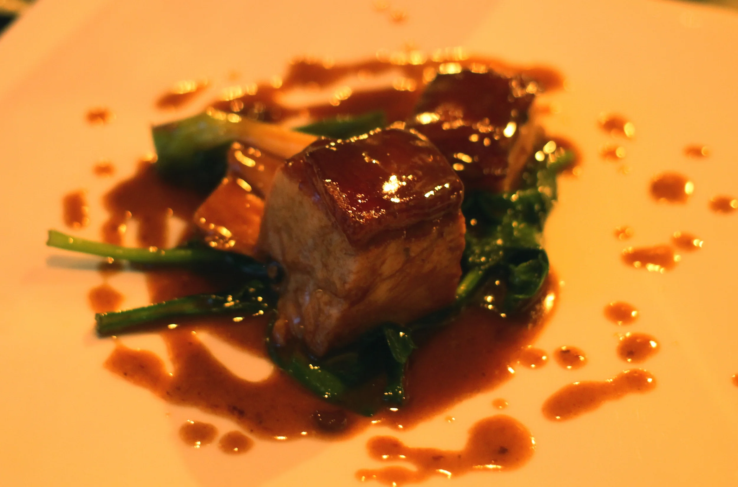 After pasta, there was pork. Belotti served the suckling pig skin on, shellacked in some kind of gelatin-rich stock-balsamic sauce. Sautéed spinach and green onion gave the plate some color and a nod towards, I dunno, balance. The pork itself was moist and almost-but-not-quite too salty, but the real winner was that crisp skin. Give me more pork skin.